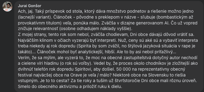 Pán Juraj to vidí ako „článoček od stola“, s jedným riešením a AI dizajnom, s podozrením, že ide o „vírenie hladiny pred voľbami“. Vraj to nebolo analytické, len provokatívne.